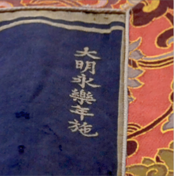 ▲明永樂(lè)織錦勝樂(lè)金剛唐卡(局部)。 這是一幅與眾不同的勝樂(lè)金剛唐卡。 不同于傳統(tǒng)勝樂(lè)金剛眉頭緊鎖、怒目圓睜的造型,這幅唐卡里的勝樂(lè)金剛眉如水波、眉眼帶笑。難道佛像亦有不同的“表情包”嗎? 01 唐卡與明成祖朱棣的神奇聯(lián)系 這幅與眾不同的唐卡,被稱(chēng)作“明永樂(lè)織錦勝樂(lè)金剛唐卡”,現(xiàn)收藏于西藏山南博物館。此幅唐卡通高526厘米、寬319厘米,畫(huà)心高286厘米、寬208厘米,形制巨大;畫(huà)幅中心為勝樂(lè)金剛與多吉帕姆雙身,其造型既符合量度又生動(dòng)傳神;主尊身后裝飾著桃形的火焰紋,構(gòu)圖簡(jiǎn)潔大氣;以藏青色絲綢為底,以金色絲線織造圖紋,色彩華貴而典雅;畫(huà)面右上角六字金色漢文楷書(shū)“大明永樂(lè)年施”題款。