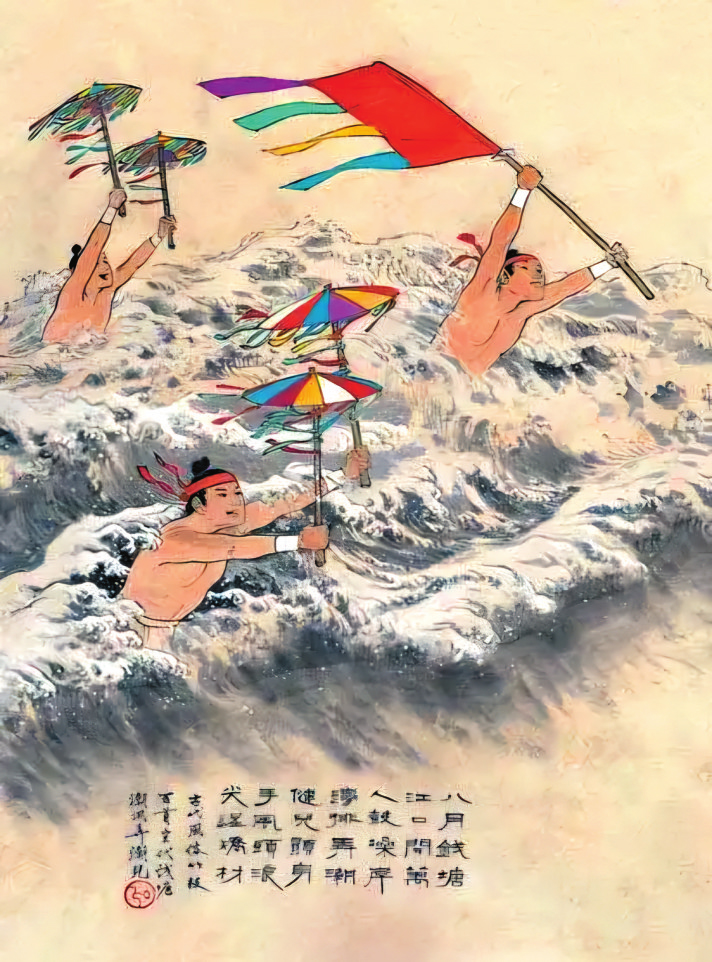 能在大江大河中搏擊風(fēng)浪的游泳好手,被人們尊稱為“弄潮兒”。唐人李益曾作閨怨詩《江南曲》:“嫁得瞿塘賈,朝朝誤妾期。早知潮有信,嫁與弄潮兒。”南宋錢塘江弄潮是一大盛事,“浙江之潮,天下之偉觀也”。在“大聲如雷霆,震撼激射,吞天沃日,勢極雄豪”的潮水中,數(shù)百名弄潮兒“皆披發(fā)文身,手持十幅大彩旗,爭先鼓勇,溯迎而上,出沒于鯨波萬仞中,騰身百變,而旗尾略不沾濕,以此夸能”。辛棄疾夸他們“不怕蛟龍怒。風(fēng)波平步??醇t旆驚飛,跳魚直上,蹙踏浪花舞”,潘閬更是贊嘆“弄潮兒向濤頭立,手把紅旗旗不濕”。