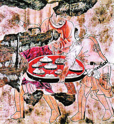 如今的主食豐富多樣,不僅包括面條、餃子、餛飩、米粉等面制品,還有以玉米、小米等雜糧為代表的粗糧制品。其實(shí),宋代已形成中國人主食的雛形,《東京夢華錄》載:“凡餅店,有油餅店,有胡餅店。若油餅店,即賣蒸餅、糖餅、裝合、引盤之類。胡餅店即賣門油、菊花、寬焦、側(cè)厚、油碢、髓餅、新樣滿麻。每案用三五人捍劑卓花入爐。”“蒸餅”即炊餅,“裝合”即盒裝的餅,“引盤”是盛于盤中的食品,“捍劑卓花”意思是把面團(tuán)先分成大小相近的劑子,再分別搟開成餅,最后捏出花樣。