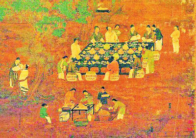 宋代面食既有團(tuán)子狀、面疙瘩狀的,也有薄片狀、條狀的,前者可以用湯匙吃,后者多用筷子吃。此外,《東京夢華錄》中還詳細(xì)介紹了宋代餐廳的外觀、菜肴及客人點(diǎn)菜方法:“每店各有廳院東西廊,稱呼坐次。客坐,則一人執(zhí)箸紙,遍問坐客。”大意是說,每家店都有廳堂、庭院、東西廊,待客人落座,店家便送上筷子、紙花,詢問客人要吃些什么。