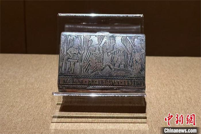 印有銘文的銀質(zhì)煙盒。程景偉 攝 展覽展出的1898年印有銘文的銀質(zhì)煙盒,小巧實用,上面刻有“1898”及亞美尼亞文字“阿爾塔什斯”“薩特尼克”。據(jù)悉,阿爾塔什斯王朝的建立者阿爾塔什斯一世和阿蘭王女兒薩特尼克公主的故事,可追溯至公元前2世紀(jì),他們的婚姻被視為不同民族和文化統(tǒng)一的象征。 在19世紀(jì)印有銘文的圣物盒上,印有亞美尼亞銘文“埃奇米亞津”和埃奇米亞津教堂的圖案。圣物盒主要用于存放和展示與圣人或重要宗教人物有關(guān)的遺物。在亞美尼亞,人們通常認(rèn)為這些遺物是神圣的,具有治療作用或精神力量。