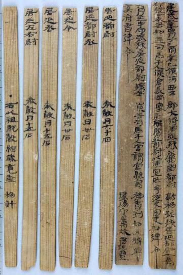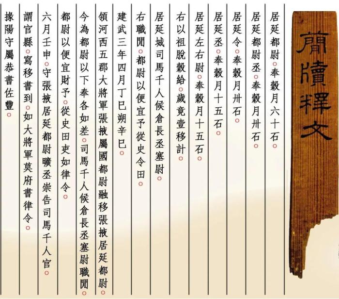 “建武三年四月丁巳朔辛巳,領(lǐng)河西五郡大將軍張掖屬國都尉融移張掖居延都尉,今為都尉以下奉各如差,司馬千人候倉長丞塞尉職閑,都尉以便宜財予,從史田吏如律令……”出土于內(nèi)蒙古額濟(jì)納旗甲渠候官遺址的《建武三年居延都尉吏奉例》由10枚簡組成,每簡長22.8厘米,前兩簡寬2.5厘米、其余8簡寬1.4厘米,全文200字。