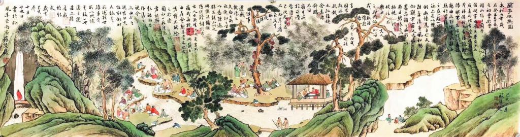 東晉永和九年(353年)上巳節(jié),會(huì)稽內(nèi)史王羲之和謝安、孫綽等人在山陰蘭亭修禊,曲水流觴,飲酒賦詩,所作詩歌后來結(jié)集為《蘭亭集》,王羲之為之撰序,即被稱作“天下第一行書”的《蘭亭序》,而蘭亭雅集的詩酒風(fēng)流也成為千古佳話。在后世仿效的各類蘭亭雅集中,詩歌、繪畫、書法等多種藝術(shù)元素爭奇斗艷,形成華麗精致、傳承千載的文化景觀。