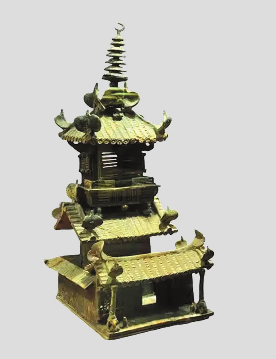 樓閣式塔是樓閣上增加塔剎而形成的。湖北省襄樊市(今湖北省襄陽市)樊城一座墓葬曾出土過樓閣式佛塔模型,通高104厘米,有兩層,屋頂有7層相輪,塔剎頂端有仰月。1986年,四川省博物館的工作人員采集到一塊漢代畫像磚,上面也有清晰的樓閣式塔圖案。樓閣和樓閣式塔不同,樓閣式塔必須具備佛塔的標(biāo)志——塔剎。塔剎的基本形式是覆缽式塔的縮小版,也就是說將印度形體巨大的覆缽式塔,微縮之后放置于中國傳統(tǒng)的樓閣頂上,就形成了樓閣式塔。