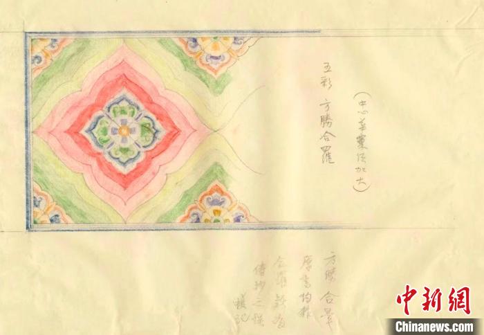 5月27日,“彩畫千年——中國(guó)官式彩畫傳承與創(chuàng)新展”在故宮博物院永壽宮展廳正式對(duì)公眾開(kāi)放。圖為梁思成手繪的宋代五彩方勝合羅(復(fù)制品)。(故宮博物院供圖)