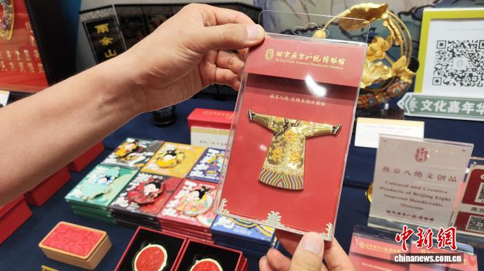 北京燕京八絕博物館依照館藏文物“京繡龍袍”設(shè)計(jì)的冰箱貼。(《中國新聞》報 任德輝 攝)