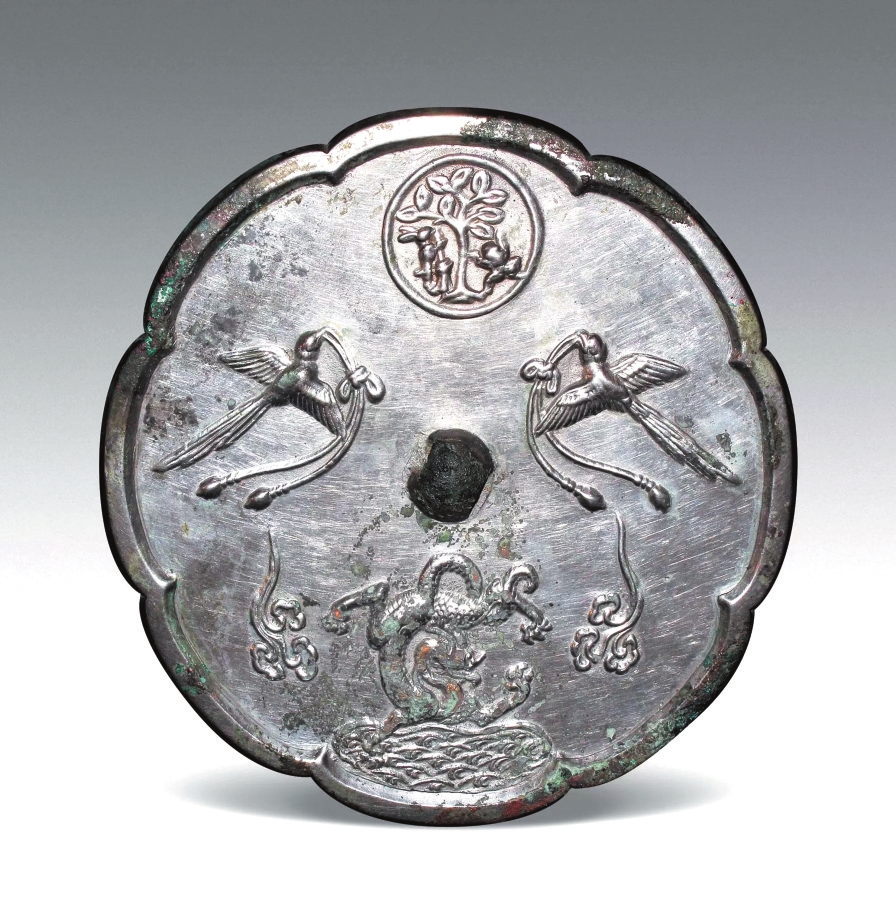 唐代張匯的《千秋鏡賦》云,千秋鏡背“或鑄或镕,是磨是削??桃詾辇?,鏤以成鵲”,《文苑英華》亦載“鵲飛如向月,龍盤以映池”,與盤龍雙鵲月宮鏡上的紋飾恰好相符。盤龍、雙鵲、祥云,月宮中的玉兔、蟾蜍、桂樹,成為此類銅鏡的畫面主體,引發(fā)人們對(duì)月宮的美好想象。