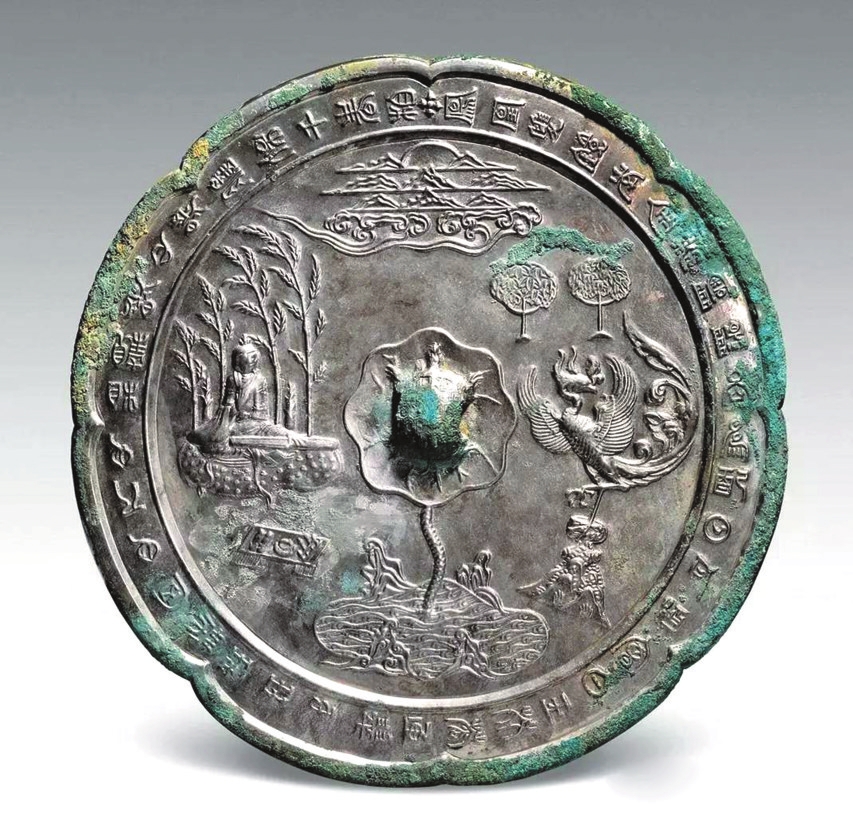 真子飛霜鏡一般都是圓形、葵花形,而西安出土的一面鏡形十分罕見(jiàn),為亞字形。鏡背上方云海托月,半個(gè)月亮浮上來(lái)。真子飛霜鏡的形制,多在細(xì)節(jié)上略有差異。除了鏡鈕上方有“真子飛霜”四字,或者有一只飛翔的仙鶴之外,還有一種在鏡緣飾篆書體銘文,鏡銘為:“鳳凰雙鏡南金裝。陰陽(yáng)各為配,日月恒相會(huì)。白玉芙蓉匣,翠羽瓊瑤帶。同心人,心相親,照心照膽保千春?!?/p>