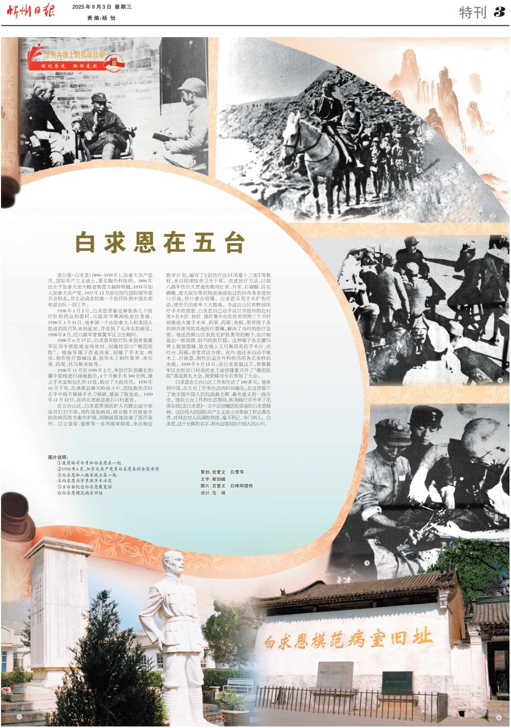白求恩在五臺山區(qū)工作和生活了100多天。他來到中國,在五臺工作和生活的時間最長,在這里留下了他支援中國人民抗戰(zhàn)最光輝、最有意義的一段歷史。他在五臺工作和生活期間,躬身踐行并升華了毛澤東《紀(jì)念白求恩》一文中總結(jié)概括的崇高的白求恩精神。這位偉大的國際共產(chǎn)主義戰(zhàn)士對革命工作認(rèn)真負(fù)責(zé),對同志對人民滿腔熱忱,毫不利己,專門利人。白求恩,這個光輝的名字,將永遠(yuǎn)銘刻在中國人民心中。