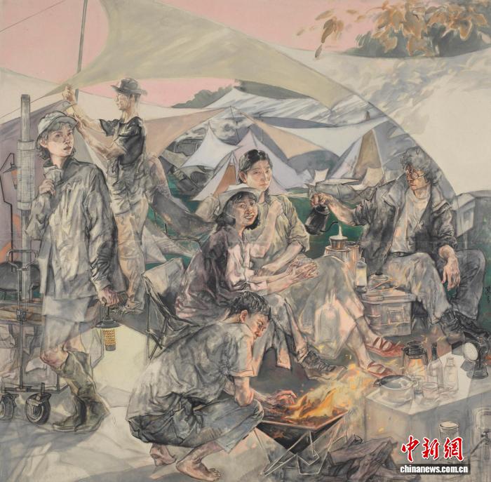 以畫(huà)家藺潔青的中國(guó)畫(huà)《清風(fēng)徐來(lái)》為例,其是浙江省第十五屆美術(shù)作品展金獎(jiǎng)作品,以傳統(tǒng)人物畫(huà)技法表現(xiàn)當(dāng)代青年郊野露營(yíng)場(chǎng)景,通過(guò)描繪清風(fēng)拂過(guò)林間被永恒定格的瞬間,傳遞都市人向往自然、追求心靈自由的當(dāng)代精神,展現(xiàn)出中國(guó)傳統(tǒng)繪畫(huà)語(yǔ)言在表現(xiàn)現(xiàn)實(shí)題材上的蓬勃生命力。