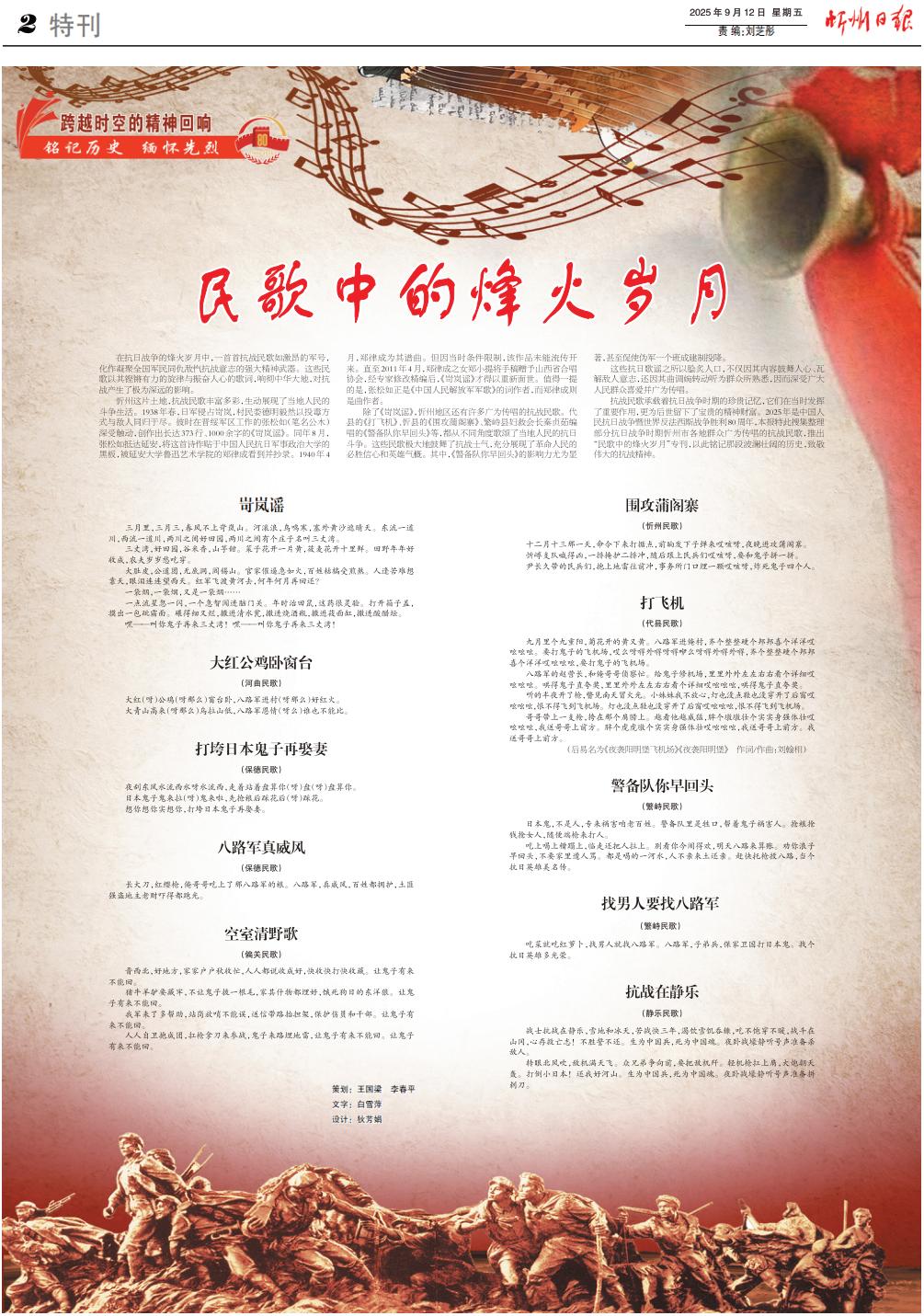 抗戰(zhàn)民歌承載著抗日戰(zhàn)爭時期的珍貴記憶,它們在當時發(fā)揮了重要作用,更為后世留下了寶貴的精神財富。2025年是中國人民抗日戰(zhàn)爭暨世界反法西斯戰(zhàn)爭勝利80周年,本報特此搜集整理部分抗日戰(zhàn)爭時期忻州市各地群眾廣為傳唱的抗戰(zhàn)民歌,推出“民歌中的烽火歲月”???,以此銘記那段波瀾壯闊的歷史,致敬偉大的抗戰(zhàn)精神。