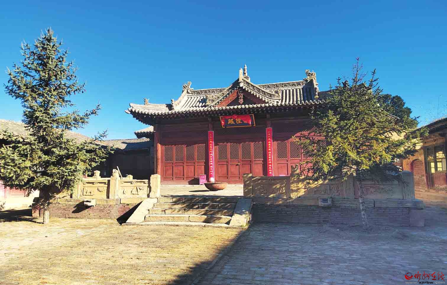 一進(jìn)院布局,中軸線現(xiàn)存有正殿1棟,兩側(cè)建有配殿,西北角建有偏殿。正殿磚砌臺(tái)基,面寬五間,進(jìn)深六椽,七檁前后廊式構(gòu)架,前檐斗拱為五踩,后檐為三踩斗拱,單檐懸山頂。前設(shè)月臺(tái),建有抱廈三間,單檐歇山頂?,F(xiàn)新塑像3尊,正殿梁架有彩繪。