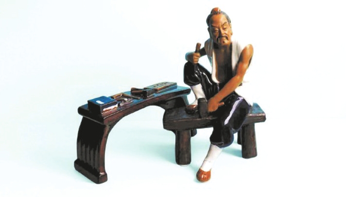 塑像高22厘米、長14厘米、寬13厘米,魯班右手持鑿、左手緊握鐵錘,雙目炯炯,仿佛正凝神思索,即將開啟一場巧奪天工的創(chuàng)作;身旁的工作臺長19.7厘米、寬6.5厘米、高10厘米,上面整齊擺放著曲尺、錘子、鑿子等工具。作品靈感源自春秋時期這位傳奇工匠的故事,以陶塑藝術(shù)為載體,栩栩如生地呈現(xiàn)出魯班的形象,讓歷史底蘊與藝術(shù)魅力交融出獨特的韻味。