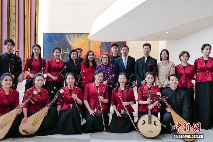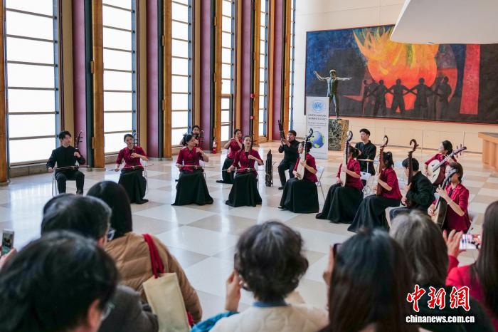 當?shù)貢r間2月25日,來自中央音樂學院的民樂演奏家在紐約聯(lián)合國總部上演快閃音樂會。圖為音樂會現(xiàn)場。 中新社記者 王帆 攝 當天,17位演奏家?guī)碜髌贰断蚕喾辍贰短焐街骸贰兑妥逦枨贰读枷贰顿愸R》《牧童短笛》《雪絨花》《花好月圓》,吸引聯(lián)合國各國工作人員、外交官及游客駐足聆聽。 聯(lián)合國副秘書長兼開發(fā)計劃署副署長徐浩良在現(xiàn)場歡迎中國藝術家的到來。聯(lián)合國婦女協(xié)會主席安妮特·海拉佩蒂安向中國藝術家表達謝意,感謝他們支持慈善事業(yè)。 本次音樂會由聯(lián)合國婦女協(xié)會牽頭舉辦,旨在讓更多人關注婦女與兒童議題。在演出間隙,中央音樂學院民族管弦樂團及現(xiàn)場觀眾向該協(xié)會慷慨捐款。中央音樂學院胡瑜教授表示,希望音樂能為人們帶去歡樂、和平與愛。