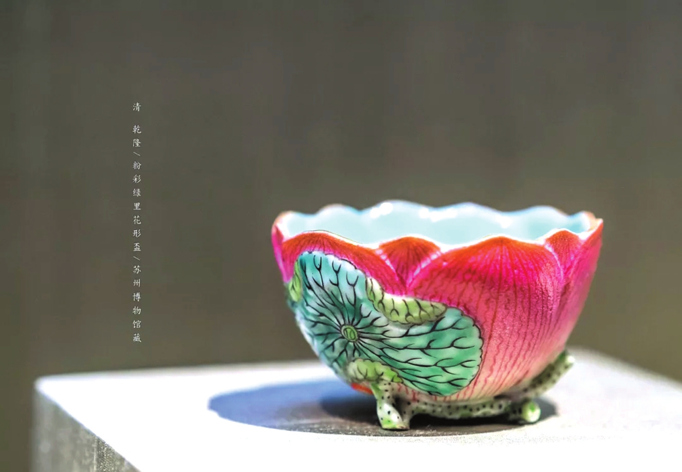相比之下,仿生瓷則源于對(duì)自然的崇尚,以豐富的造型模擬自然物象,取材生動(dòng),花草蔬果、鳥獸蟲魚,以至木石紋理皆可入瓷。它們或潑辣清新,或簡(jiǎn)練樸素,既展現(xiàn)了工匠高超的塑形技藝,更傳遞著“天人合一”的造物思想以及追求野趣、崇尚自由、返璞歸真的人生境界。如元龍泉窯荷葉蓋罐、萬歷青花梵文蓮瓣盤、乾隆粉彩綠里花形杯、道光木紋釉花盆等,都是平時(shí)難得一見的館藏仿生瓷器。(許鑫城)