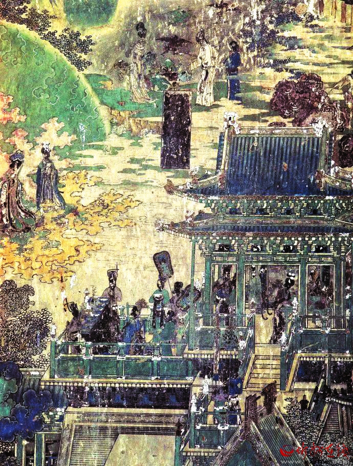 畫面中,有頭戴冠冕、身著長(zhǎng)袍的王子,焚香祈禱的王后;有嬉戲玩耍的兒童,酒樓市井里的說(shuō)唱賣藝者;還有撐傘的、捧鳥(niǎo)籠的凡夫俗子,儼然一幅幅生動(dòng)的古代宮廷生活圖、古代市井圖。豪華宮殿、樓閣、古塔、作坊、民居各類建筑應(yīng)有盡有,無(wú)不體現(xiàn)出畫師高超的技藝。