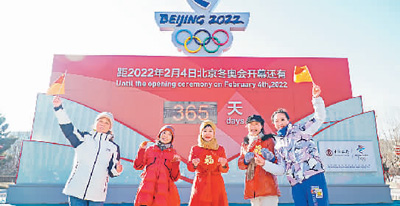 2月4日,河北張家口經(jīng)開(kāi)區(qū)的市民共同慶祝2022北京冬奧會(huì)開(kāi)幕倒計(jì)時(shí)一周年。畢瑞翔攝(人民視覺(jué))