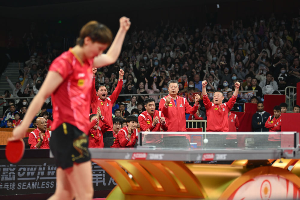 12月7日,中國隊(duì)選手王曼昱與教練員在得分后慶祝。新華社記者 胥冰潔 攝