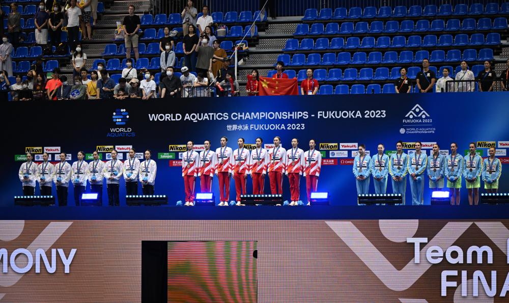 7月21日,在日本福岡舉行的2023年世界游泳錦標(biāo)賽花樣游泳集體自由自選決賽中,中國隊(duì)以329.1687分的成績獲得冠軍。新華社記者 夏一方 攝