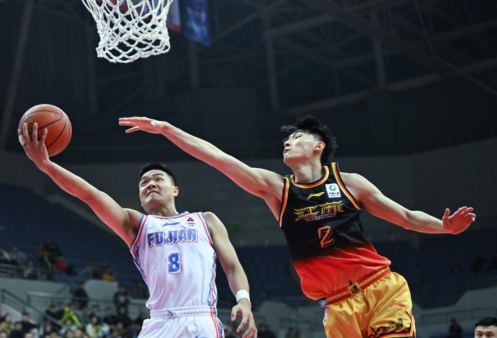 1月4日,福建隊球員黎伊揚(yáng)(左)在江蘇隊球員馬建豪的防守下上籃。新華社發(fā)(王須中攝)