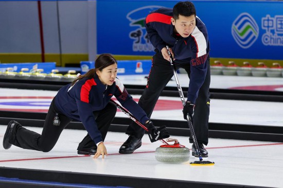 20日,在第十四屆全國冬季運動會冰壺(公開組)混雙決賽中,黑龍江隊以7:6險勝福建隊,奪得金牌。