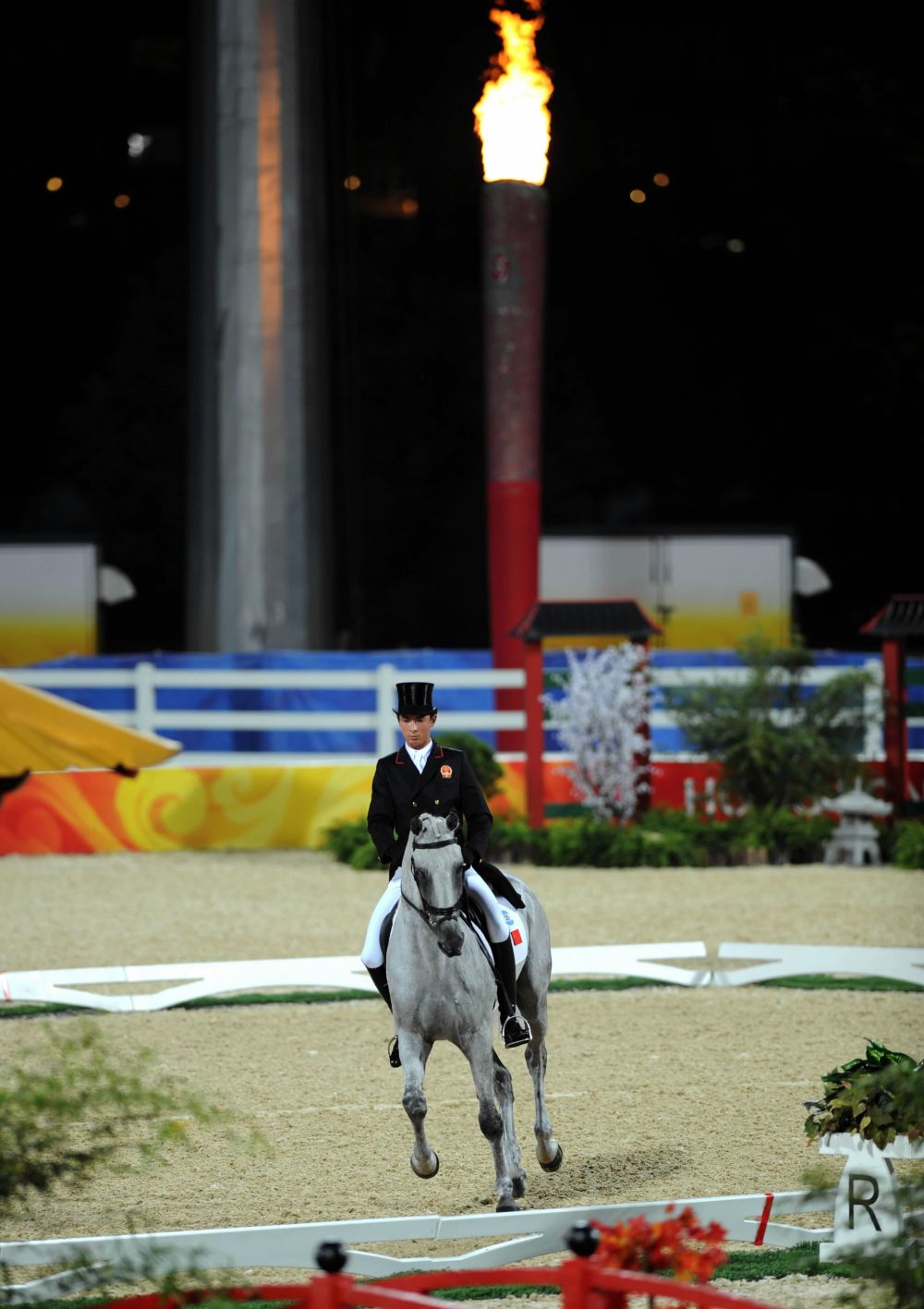 2008年8月9日,中國騎手華天在比賽中。當日,中國騎手華天在香港參加北京奧運會馬術(shù)比賽三項賽盛裝舞步賽,這是中國運動員首次亮相奧運馬術(shù)比賽場。新華社記者 盧炳輝 攝