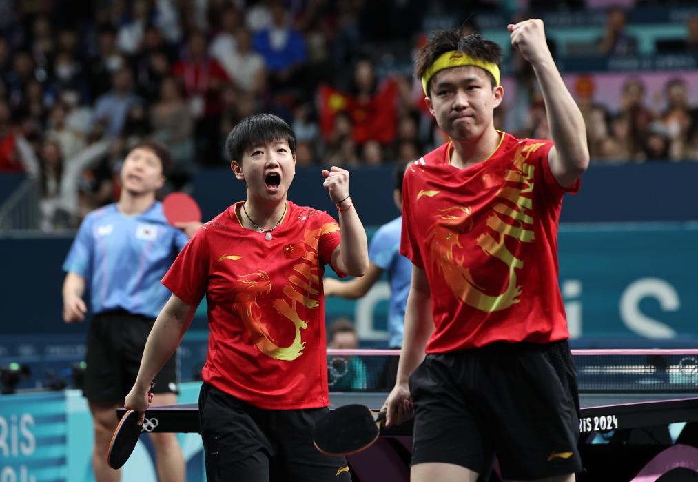 7月29日,王楚欽/孫穎莎(左)在比賽中慶祝得分。 新華社記者 王東震 攝