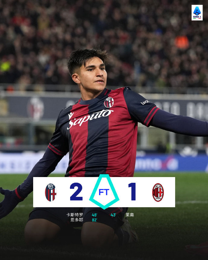 易邊再戰(zhàn),博洛尼亞在第48分鐘利用一次定位球機(jī)會,由法比安助攻卡斯特羅門前近距離推射破門,扳平比分。盡管米蘭抗議對方手球在先,但視頻助理裁判(VAR)和主裁判判定進(jìn)球有效。經(jīng)過一段時間的對攻后,第82分鐘,米蘭后防出現(xiàn)漏洞,坎比亞吉為恩多耶送上橫傳助攻,后者近距離搶點破門,幫助博洛尼亞2:1反超比分。