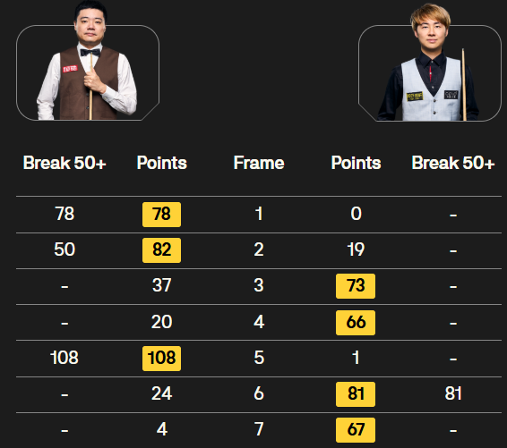 丁俊暉與徐思比賽的比分數(shù)據(jù)。圖片來自斯諾克世界大獎賽官網(wǎng)