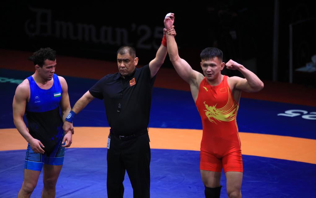 中國隊(duì)選手鄒萬豪在當(dāng)日舉行的男子自由式摔跤61公斤級銅牌賽中,以4:2戰(zhàn)勝吉爾吉斯斯坦選手梅爾扎納扎爾·吾魯。來自新疆的阿黑由·吐爾遜在74公斤級銅牌賽中,以4:0戰(zhàn)勝烏茲別克斯坦選手納斯?fàn)柼峒局Z夫,為中國隊(duì)再添一枚銅牌。