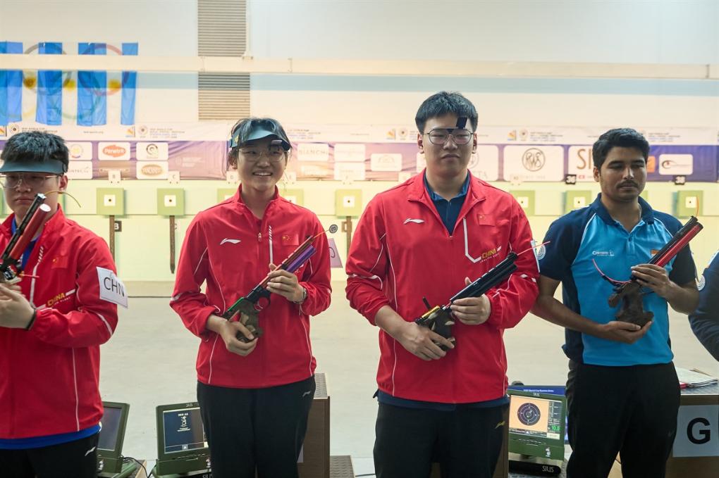 10米氣手槍混合團(tuán)體冠軍張益梵(右二)/馬千珂(右三)在比賽現(xiàn)場。圖片來自國際射聯(lián)官網(wǎng)