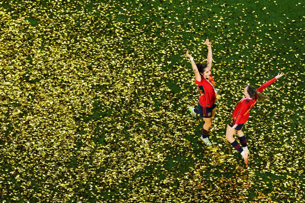 圖為西班牙隊(duì)球員在2023年國際足聯(lián)女足世界杯決賽賽后慶祝奪冠。新華社記者 白雪飛 攝