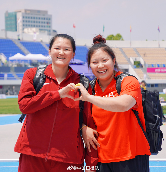 中國隊(duì)選手吉莉(右)和李江燕(左)分獲女子鏈球項(xiàng)目金、銀牌。圖源:中國田徑隊(duì)微博