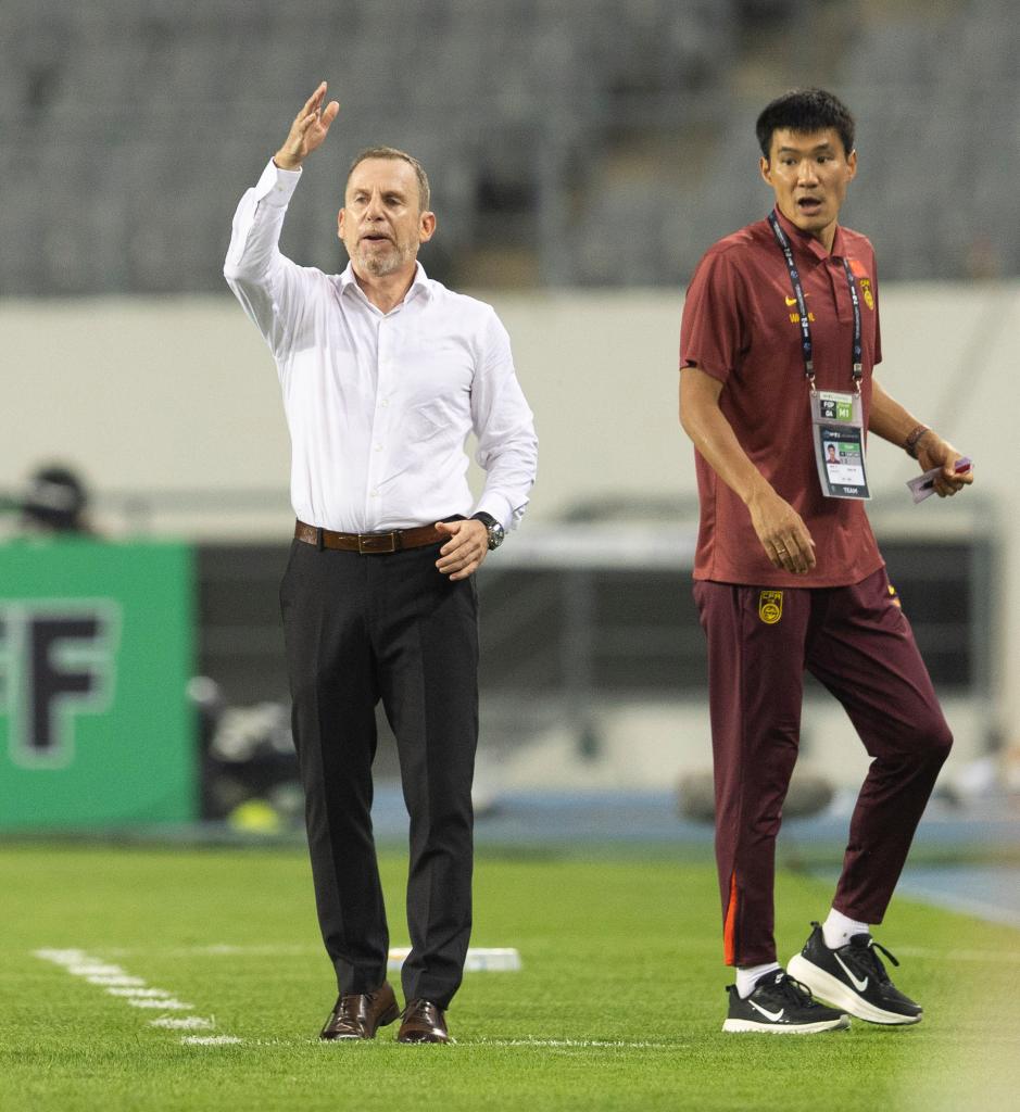 7月7日,中國隊代理主教練德?lián)P·久爾杰維奇(左)在場邊指揮。新華社發(fā)(全休相 攝)