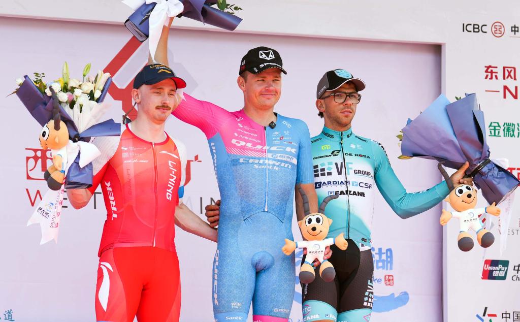 7月9日,賽段冠軍愛沙尼亞快客車隊(duì)車手拉亞斯·馬?。ㄖ校?、亞軍李寧之星車隊(duì)車手謝爾比·亞歷山大(左)、季軍意大利巴迪亞尼車隊(duì)車手扎農(nóng)塞洛·恩洛科在領(lǐng)獎(jiǎng)臺(tái)上合影。新華社記者 齊芷玥 攝