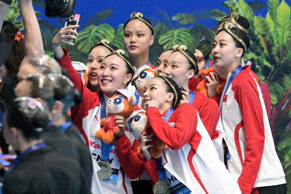 22日晚,2025年游泳世錦賽花游集體技術(shù)自選決賽,預(yù)賽排名第一的中國(guó)隊(duì)最后登場(chǎng)。中國(guó)隊(duì)沿用了世界杯總決賽時(shí)的“悟空”主題,比賽中姑娘們頭戴金箍,化身“天命人”,伴隨著《黑神話·悟空》的配樂(lè),在水中翩翩起舞。