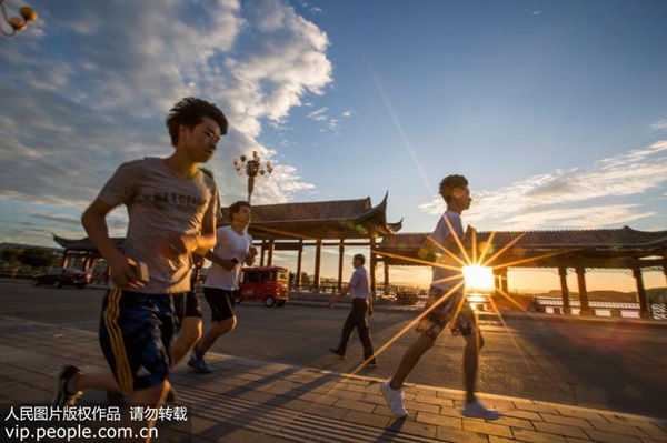 2017年7月20日,在江西都昌縣東湖畔,人們迎著朝陽晨跑。(傅建斌/人民圖片)