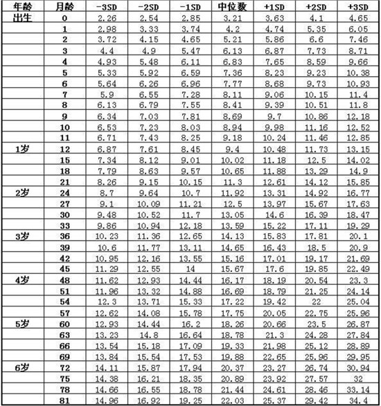 表1嬰幼兒童體重對照表(男)