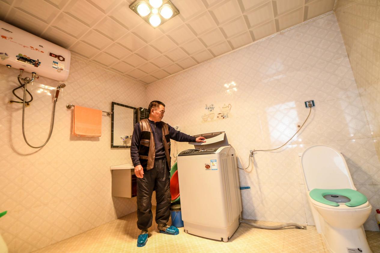 2017年1月24日,吉林延邊光東村村民全得成在自家衛(wèi)生間內(nèi)使用洗衣機(jī)。