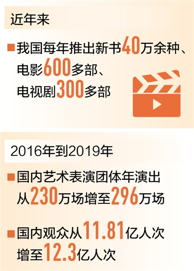 “十三五”時期是我國文藝事業(yè)的又一豐收期。文藝創(chuàng)新創(chuàng)造活力顯著增強,從小說、戲劇、音樂到美術(shù)、電影、電視,從傳統(tǒng)文藝到新興網(wǎng)絡(luò)文藝,各門類各品種涌現(xiàn)出一大批膾炙人口的優(yōu)秀作品。文藝創(chuàng)作百花齊放,文藝演出好戲連臺,文化活動精彩紛呈,群眾獲得感顯著增強。 佳作不斷、量質(zhì)齊升,文藝創(chuàng)作持續(xù)繁榮 習近平總書記指出,推動文藝繁榮發(fā)展,最根本的是要創(chuàng)作生產(chǎn)出無愧于我們這個偉大民族、偉大時代的優(yōu)秀作品。 “十三五”期間,廣大文藝工作者潛心創(chuàng)作,以創(chuàng)新精神推出一批思想精深、藝術(shù)精湛、制作精良的優(yōu)秀之作,受到了群眾的普遍歡迎。 “十三五”期間,廣大文藝工作者在關(guān)鍵時間節(jié)點創(chuàng)作了一系列大型文藝演出,如紀念抗戰(zhàn)勝利70周年文藝晚會《勝利與和平》、慶祝中國共產(chǎn)黨成立95周年音樂會《信念永恒》、慶祝改革開放40周年文藝晚會《我們的四十年》、慶祝中華人民共和國成立70周年文藝晚會《奮斗吧 中華兒女》……他們以深厚熾熱的愛國情懷和奮發(fā)向上的時代精神,奏響民族復興路上的強音。 2019年國慶,3部獻禮片《我和我的祖國》《中國機長》《攀登者》鼓舞士氣、溫暖人心、廣受好評,在觀眾滿意度調(diào)查中獲得高分,并取得了亮眼的票房成績。“十三五”期間,中國電影質(zhì)量大幅提升,《流浪地球》《紅海行動》《我不是藥神》等國產(chǎn)影片,以思想內(nèi)涵的深度開掘、拍攝制作的精益求精,增強了中國電影走向世界的底氣。 第十四屆和第十五屆精神文明建設(shè)“五個一工程”獲獎作品,集中展示了近年來我國文藝創(chuàng)作的實績,眾多高質(zhì)量作品描繪出新時代的精神圖譜。小說《云中記》《主角》、報告文學《鄉(xiāng)村國是》等文質(zhì)兼美、深邃感人,有力地傳遞了真善美的情操。反映改革開放40年壯麗征程的紀錄片《必由之路》、記錄黨的十八大以來砥礪奮進征程的政論片《將改革進行到底》等引發(fā)熱議,極大鼓舞了干部群眾繼續(xù)投身全面深化改革的斗志與干勁;電視劇《可愛的中國》《海棠依舊》《平凡的世界》《最美的青春》《大江大河》,收獲了良好口碑與收視率;《大禹治水》《熊貓和小鼴鼠》等國產(chǎn)動畫片受到小觀眾的喜愛;河北梆子《李保國》、舞劇《永不消逝的電波》、話劇《塞罕長歌》等高揚時代精神、創(chuàng)新藝術(shù)表達、強化人物塑造,集思想性和藝術(shù)性于一體;廣播劇《“事兒媽”宋小娥》立足童真童心這一主題,從最真實的生活出發(fā),于質(zhì)樸中發(fā)現(xiàn)崇高,有趣、勵志、溫暖;歌曲《不忘初心》《我們都是追夢人》等成為廣為傳唱的歌曲…… 精彩的中國故事、昂揚的時代風貌,成為文藝創(chuàng)作的富礦。國產(chǎn)電影、國產(chǎn)電視劇、國產(chǎn)綜藝節(jié)目的收視率持續(xù)走高,文藝作品成為彰顯文化自信、弘揚社會主義核心價值觀的重要載體。 在作品質(zhì)量提升的同時,我國文化產(chǎn)品的供給能力也在持續(xù)增強。目前我國每年推出新書40萬余種、童書4萬多種、電影600多部、電視劇300多部、動漫400多部……眾多文化產(chǎn)品的生產(chǎn)規(guī)模位居世界前列。演出市場持續(xù)繁榮,2016年到2019年,國內(nèi)藝術(shù)表演團體年演出場次從230萬場增長至296萬場,國內(nèi)觀眾從11.81億人次增加至12.3億人次,其中農(nóng)村觀眾超過7億人次。 “十三五”期間,文藝創(chuàng)作生產(chǎn)量質(zhì)齊升,為建設(shè)社會主義文化強國打下堅實基礎(chǔ)。 深入生活、扎根人民,與時代同步伐成為主流 我國廣大文藝工作者認真貫徹落實習近平總書記在文藝工作座談會上的重要講話精神,在火熱的現(xiàn)實生活中尋找創(chuàng)作的靈感與激情?!笆濉逼陂g,越來越多的文藝工作者走向基層一線,創(chuàng)作采風、演出慰問、結(jié)對幫扶,“深入生活、扎根人民”蔚然成風。 在新疆塔城,中國舞蹈家協(xié)會的演員們冒著嚴寒,為邊境哨所送去演出;在廣東深圳,一場暴雨突如其來,中國廣播藝術(shù)團的演員們?nèi)詧猿置坝隇樯鐓^(qū)群眾演出;在重慶,國家交響樂團開展“結(jié)對子、種文化”項目,幫助當?shù)孛ね瘜W生和村民登上國家大劇院舞臺;在內(nèi)蒙古,烏蘭牧騎演員每年為牧民群眾演出數(shù)千場…… “十三五”期間,全國文藝界積極開展“我們的中國夢——文化進萬家”、心連心、送歡樂下基層和文藝志愿服務(wù)活動,取得明顯成效。全國文化系統(tǒng)每年開展“深入生活、扎根人民”相關(guān)活動約1萬項,參與的文藝工作者約10萬人次,受益群眾超6億人次。全國文化部門所屬藝術(shù)表演團體組織政府采購的公益演出從2016年的13.9萬場,增加至2019年的15.73萬場,累計觀眾超過4.3億人次。這些公益演出大多數(shù)在老少邊窮地區(qū)舉行,主要觀眾是農(nóng)村居民、社區(qū)居民、老紅軍、留守兒童等。 “十三五”期間,廣大文藝工作者緊扣時代脈搏,圍繞脫貧攻堅等重大主題開展創(chuàng)作,涌現(xiàn)出《十八洞村的十八個故事》《經(jīng)山?!贰稇已麓濉返葍?yōu)秀現(xiàn)實題材文學作品,生動反映十八大以來歷史性成就和歷史性變革,