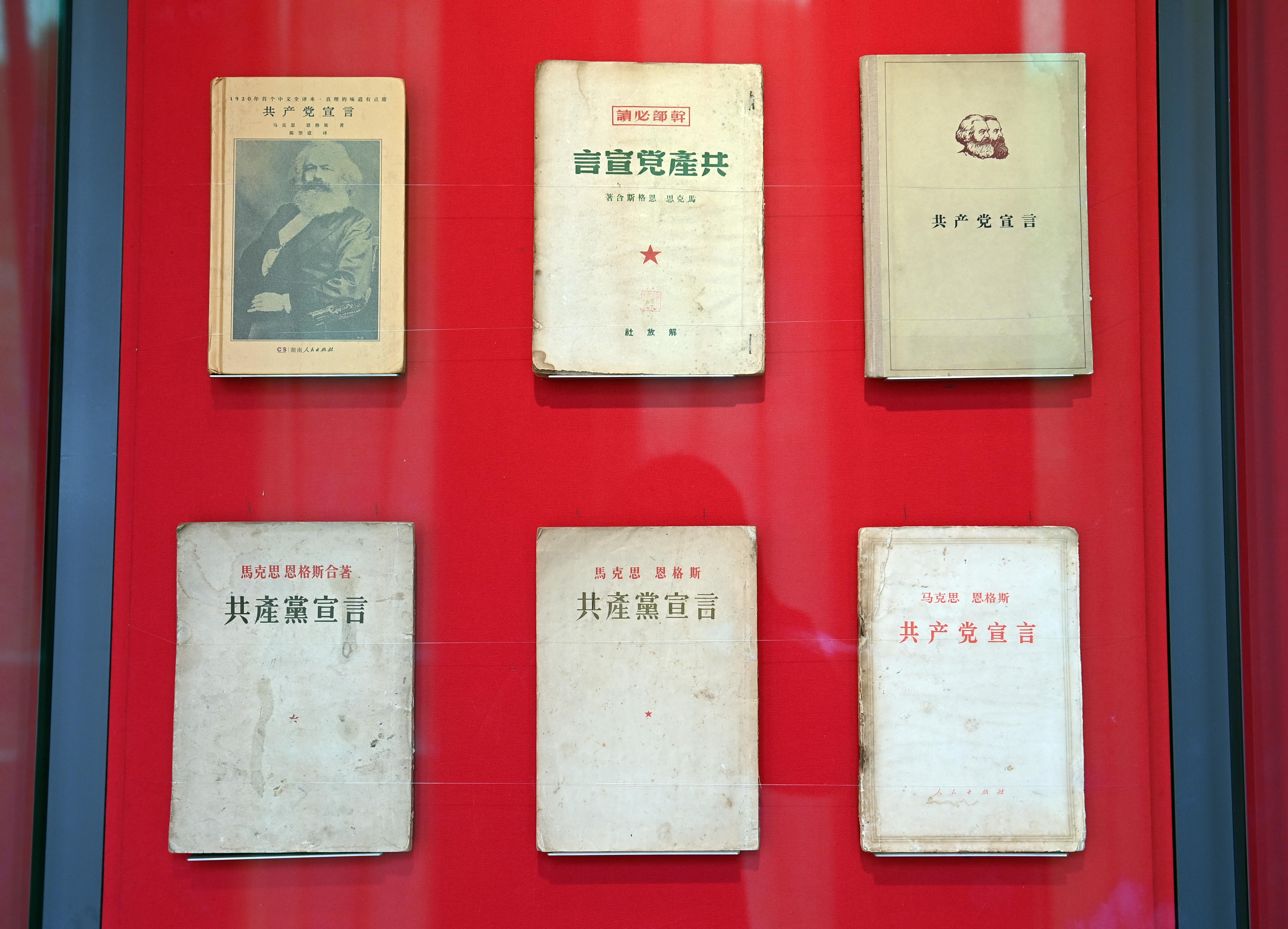 △中國國家版本館中央總館展示的不同版本的《共產黨宣言》。