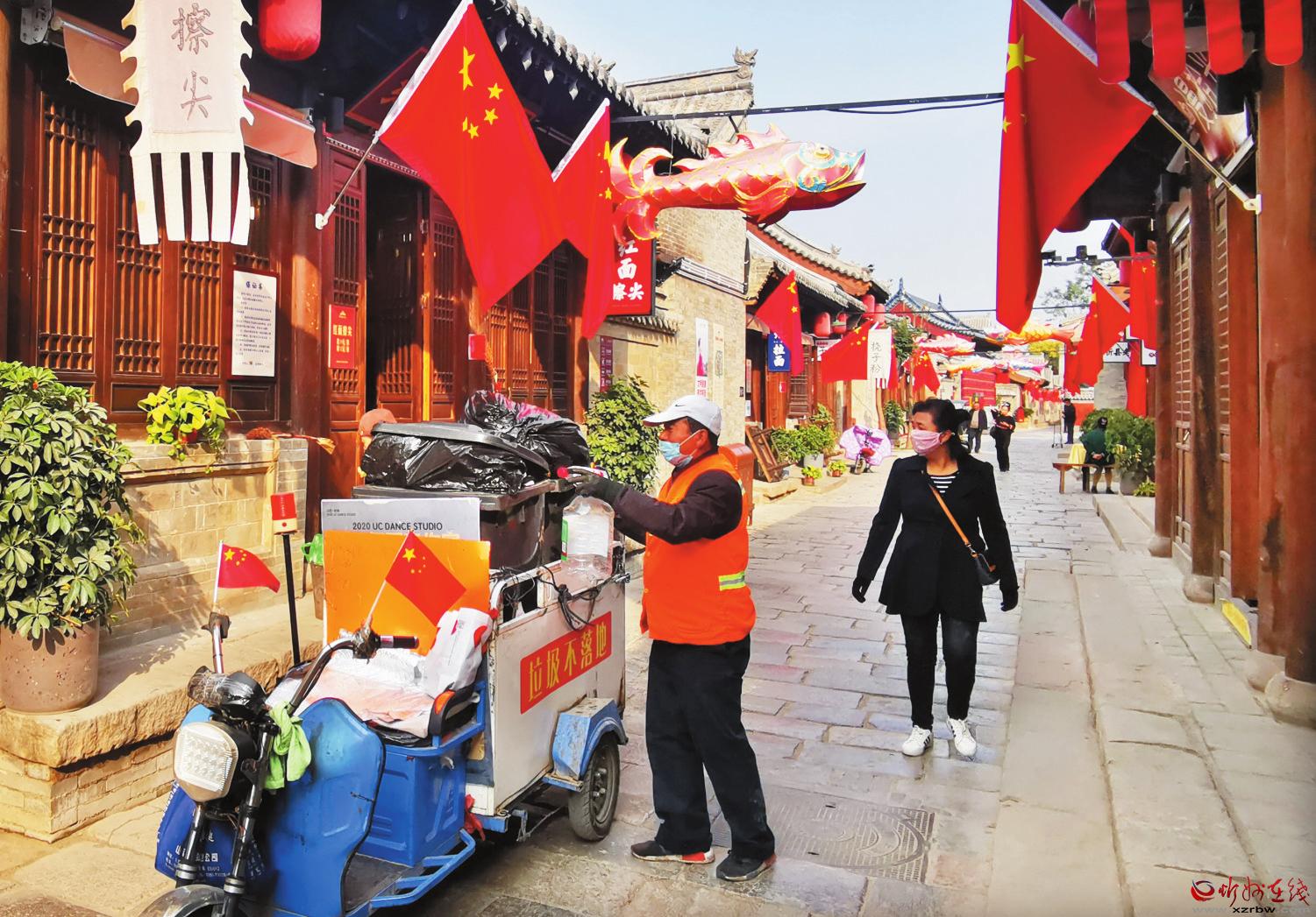 10月14日,忻州古城的環(huán)衛(wèi)工人正在上門收運沿街商戶產(chǎn)生的垃圾,保證日產(chǎn)日清,垃圾不落地。(張存良 攝)