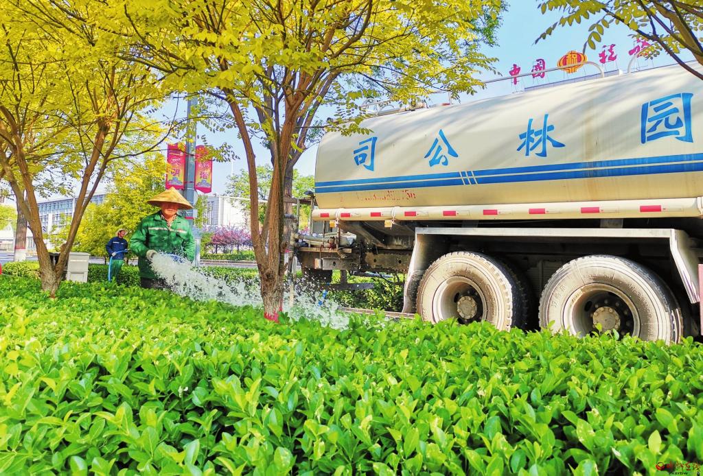 5月21日,園林工人在忻州城區(qū)長征西街澆灌綠化帶。近期氣溫上升,苗木需水量變大,園林工人每天三次為綠植補充水分,確保文明城市花園綠地郁郁蔥蔥。 (宮清華 攝)