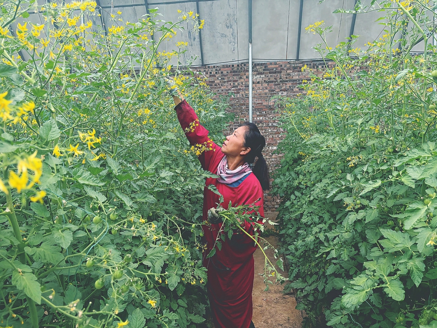 山河村大棚采摘園的工作人員正在給小番茄打杈。本報實(shí)習(xí)記者姚雅馨攝