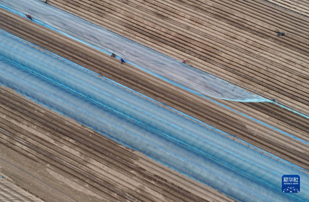 在河北省趙縣韓村鎮(zhèn),農(nóng)民在搭建姜棚(3月30日攝,無人機(jī)照片)。(新華社記者 楊世堯 攝)