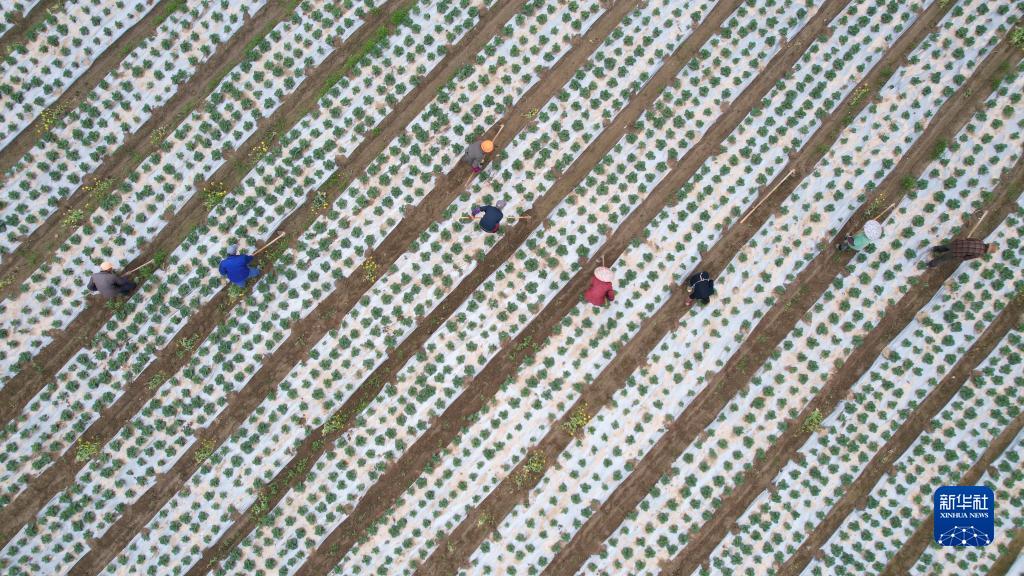 在湖南省永州市道縣梅花鎮(zhèn)貴頭村,村民在菜地里勞作(4月4日攝)。(新華社發(fā) 何紅福 攝)