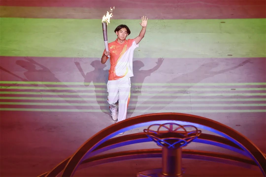 開幕式之夜,最為激動(dòng)人心的就是點(diǎn)火時(shí)刻。在射擊世界冠軍張益梵、鄉(xiāng)村干部王春、環(huán)衛(wèi)工人孫秀蘭、大國工匠官生花、公交司機(jī)馮冰依次傳遞過后,火炬來到了最后一棒火炬手、北京冬奧會(huì)冠軍蘇翊鳴的手中。主火炬塔點(diǎn)火裝置以山西民俗“旺火”為設(shè)計(jì)依據(jù),采用清潔能源“微火”點(diǎn)燃的方式。蘇翊鳴手持火炬,在萬眾矚目之下,以“微火”點(diǎn)“旺火”,歷史、現(xiàn)在與未來,在這一刻融匯賡續(xù)。