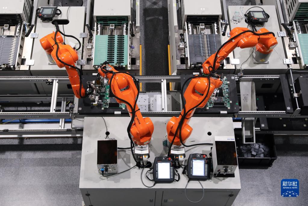 5月22日,在紫光恒越(杭州)技術(shù)有限公司“未來(lái)工廠”,機(jī)械臂在工作中。新華社記者 杜瀟逸 攝