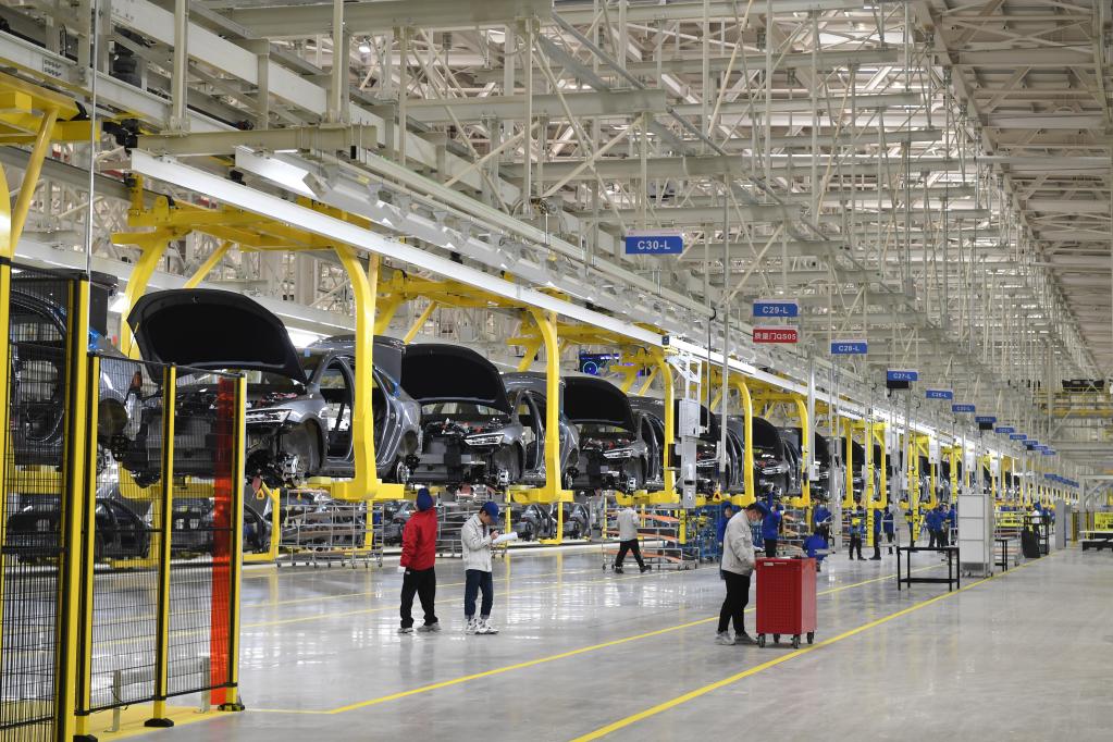 在合肥經(jīng)濟技術(shù)開發(fā)區(qū)的一家新能源汽車生產(chǎn)企業(yè),工人在整車生產(chǎn)線上作業(yè)。新華社發(fā)(解琛攝)