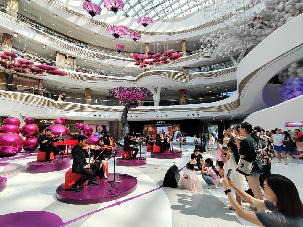 端午假期,??趪H免稅城內(nèi),伴隨著悠揚(yáng)的音樂,陽光傾瀉“天際秘林”夢幻舞臺,正在購物的游客們紛紛駐足欣賞。“一場室內(nèi)音樂會,給購物消費增添了新意和氛圍感?!焙?谑忻耜惱俪两陉柟夂鸵魳分?。